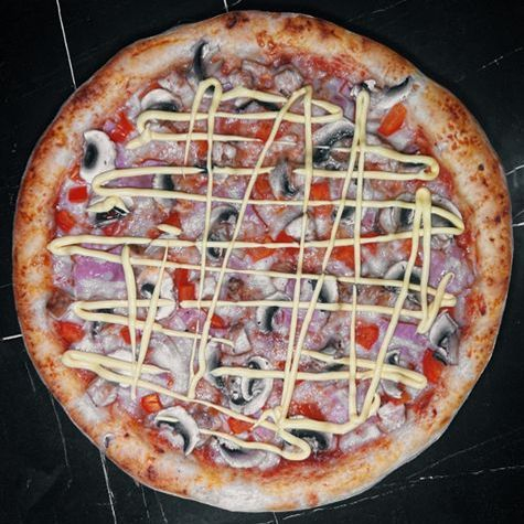 Томатная основа, сыр Моцарелла, ветчина, шампиньоны.