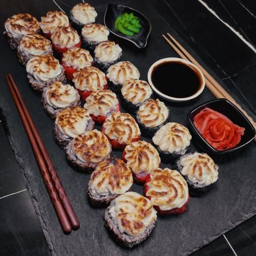 Ролл Сяке, ролл Филадельфия манго, ролл Чука, ролл с беконом, ролл Чедер, ролл Авокадо Мама, ролл Lux, ролл Техас, ролл Африка, ролл Аляска, ролл Филадельфия с креветкой, ролл Филадельфия с тунцом, ролл Филадельфия, хосомаки с крабом, хосомаки с тунцом, темпура ролл Кенчо, темпура ролл Эби, запеченный ролл Бекон, запеченная Калифорния, запеченный ролл Филадельфия.