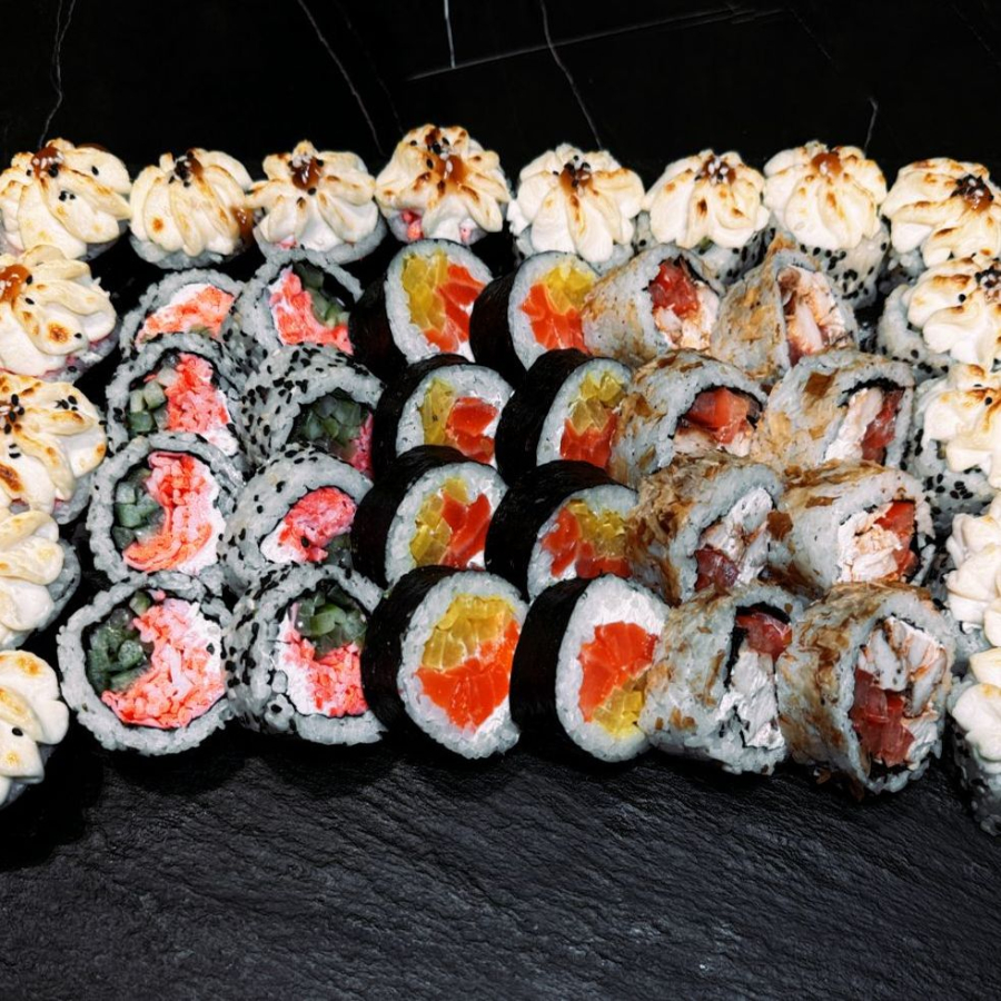 Ролл Сяке, ролл Филадельфия манго, ролл Чука, ролл с беконом, ролл Чедер, ролл Авокадо Мама, ролл Lux, ролл Техас, ролл Африка, ролл Аляска, ролл Филадельфия с креветкой, ролл Филадельфия с тунцом, ролл Филадельфия, хосомаки с крабом, хосомаки с тунцом, темпура ролл Кенчо, темпура ролл Эби, запеченный ролл Бекон, запеченная Калифорния, запеченный ролл Филадельфия.