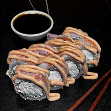 Рис, нори, сыр, лосось, креветка в темпуре, манго.