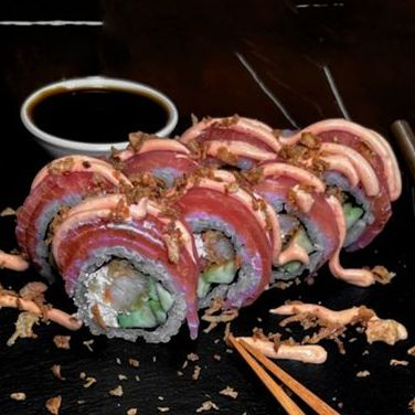 Рис, нори, сыр, тунец, креветка в темпуре, огурец, жареный лук, спайси соус.