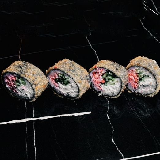 Рис, нори, лосось, сыр, тунец, огурец, кляр (мука темпура, вода), сухари панировочные Панко.