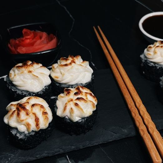 Рис, нори, огурец, лосось, краб, кунжут черный, соус для запекания.