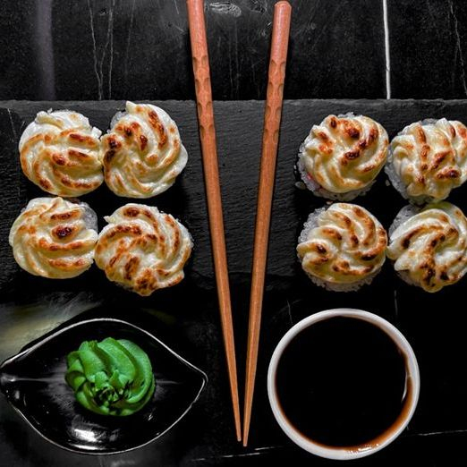 Рис, нори, сыр, курица, карамелизованный лук, кунжут, соус для запекания.