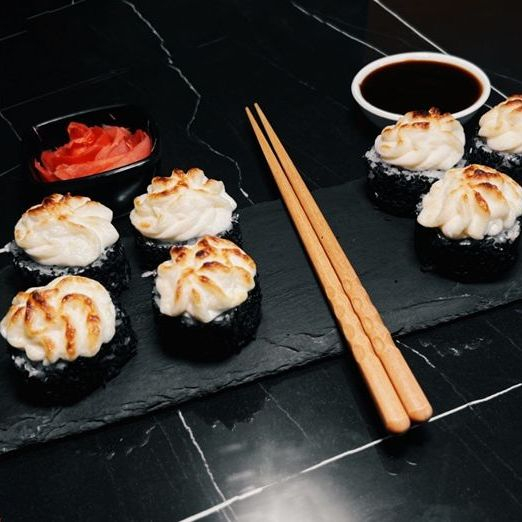 Рис, нори, огурец, лосось, краб, кунжут черный, соус для запекания.