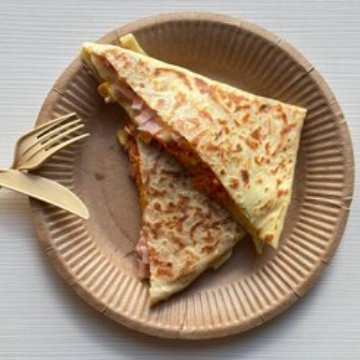 Ветчина, сыр, шампиньоны консервированные, морковь по-корейски, огурец маринованный, соус фирменный, тесто.