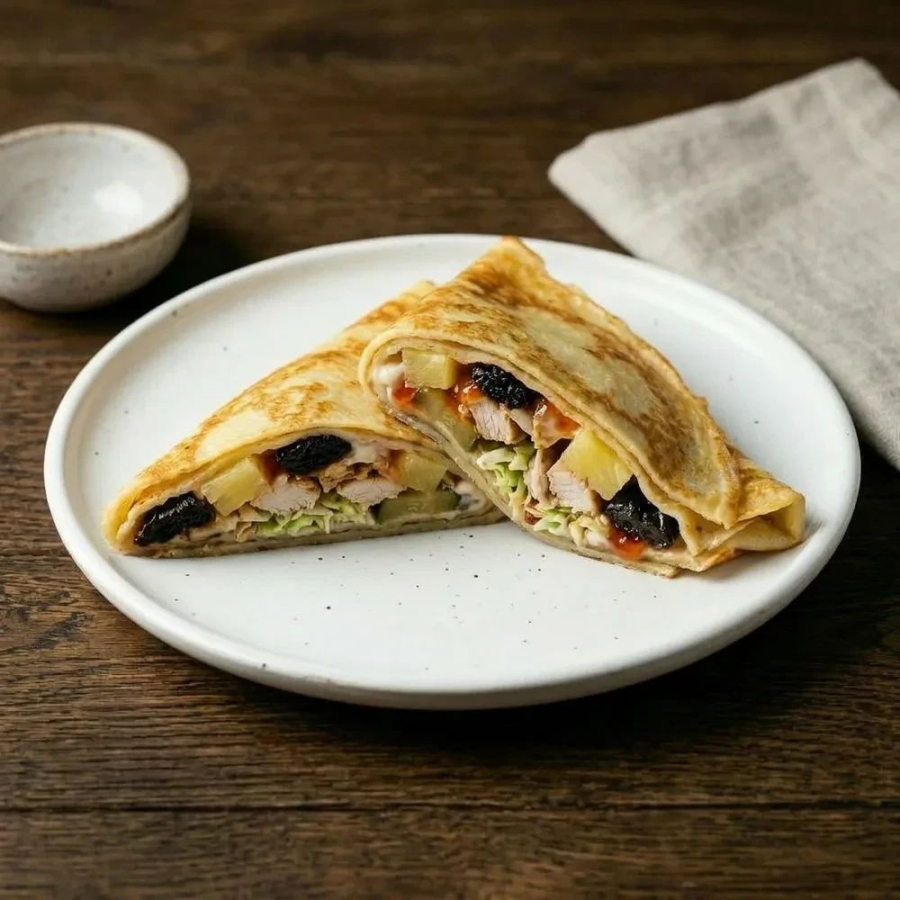 Ананас консервированный, блин, мясо птицы, огурец соленый, пекинская капуста, соус сладкий чили, соус чесночный, чернослив.