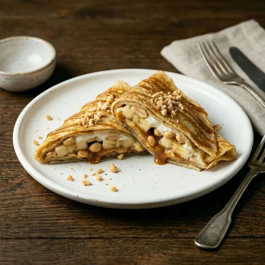 Арахис обжаренный, банан свежий, блин, греческий йогурт, топпинг соленая карамель.