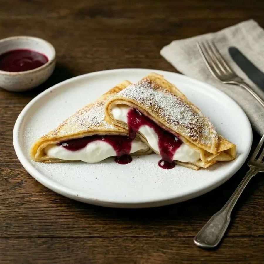 Блин, сахарная пудра, греческий йогурт, топпинг лесные ягоды.