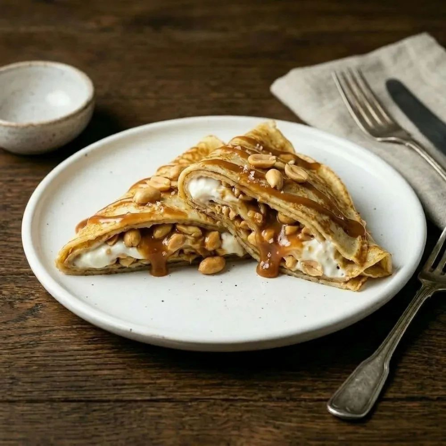 Арахис обжаренный, блин, греческий йогурт, топпинг соленая карамель.