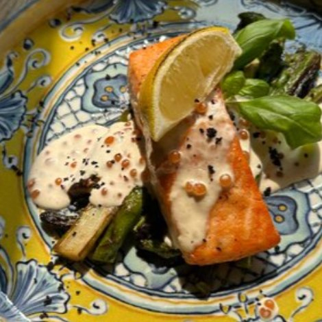 Филе форели, спаржа, сливки, икра, лимон.