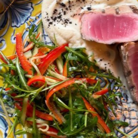 Филе тунца, мусс из сельдерея, рукола, перец болгарский, огурец, кунжутное масло.