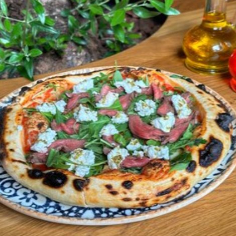 Томаты пелати, моцарелла, ростбиф, сыр творожный, рукола, соус песто, пармезан, тесто.