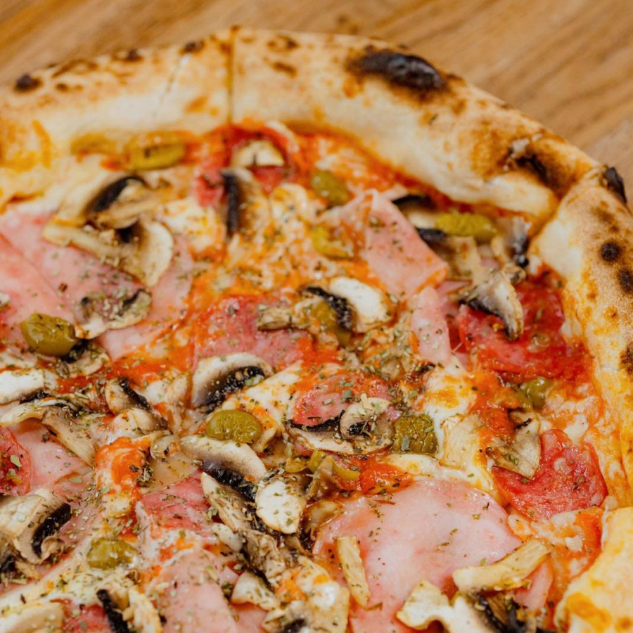 Соус сливочный/томатный(на выбор), моцарелла, ветчина, салями, маслины, шампиньоны, орегано.