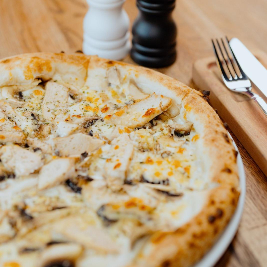Соус сливочный, моцарелла, филе цыпленка су-вид, шампиньоны, пармезан,орегано.
