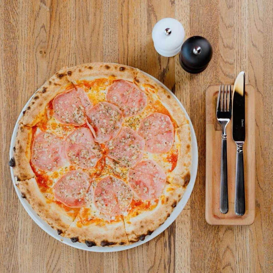 Соус сливочный/томатный(на выбор), моцарелла, ветчина, салями, бекон, орегано.