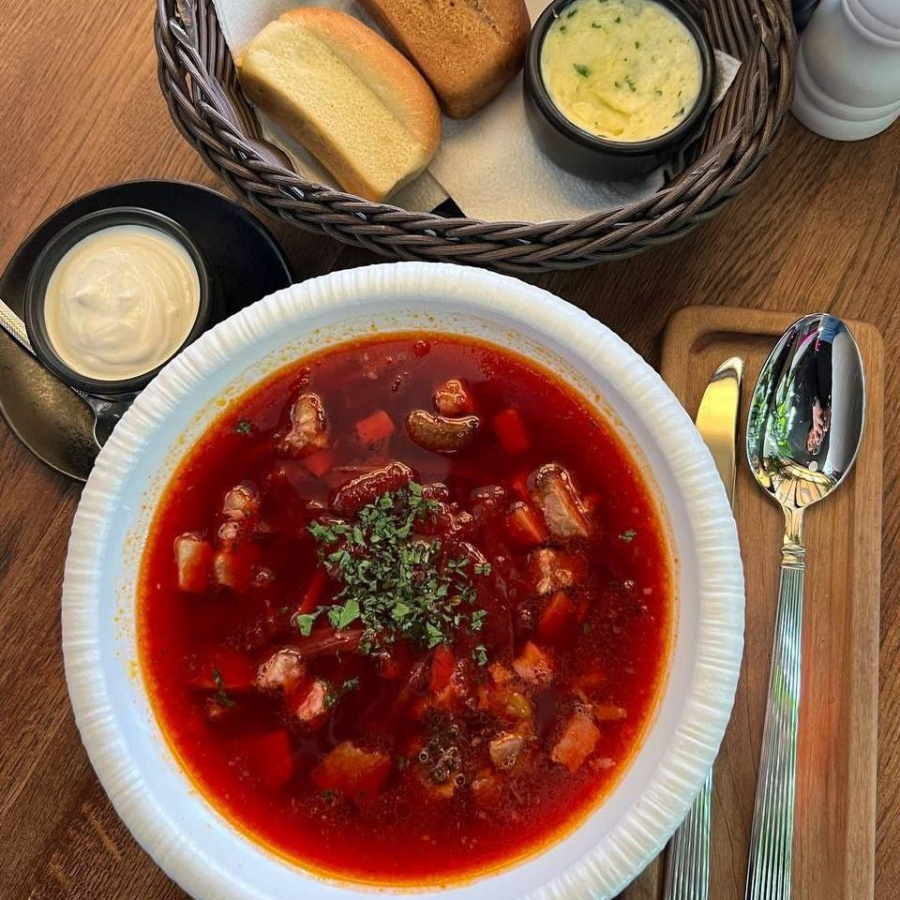 Говяжий бульон, свинина, свекла, томатная паста, сельдерей, перец болгарский, капуста, лук, морковь, чеснок, уксус, петрушка, сметана, масло пряное, булочка Бородинская, булочка пшеничная.