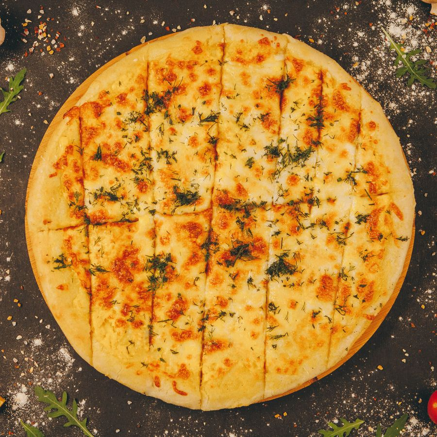 Заказать Вкусная закуска в форме пиццы, поделенная на палочки, удобно кушать для компании или для детей. Сырный соус, моцарелла, зелень укропа, пармезан.