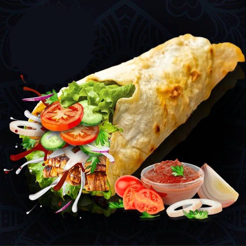 Заказать Сочная курица на гриле, лаваш армянский, соус чесночный, маринованный огурчик, помидор. капуста, лук, аджика, петрушка.
