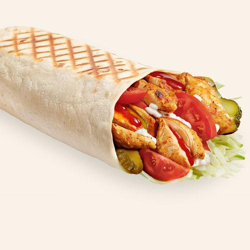 Лаваш, сочная курица, соленый огурец, помидор, салат из капусты, фирменный соус, барбекю соус, зелень, специи.