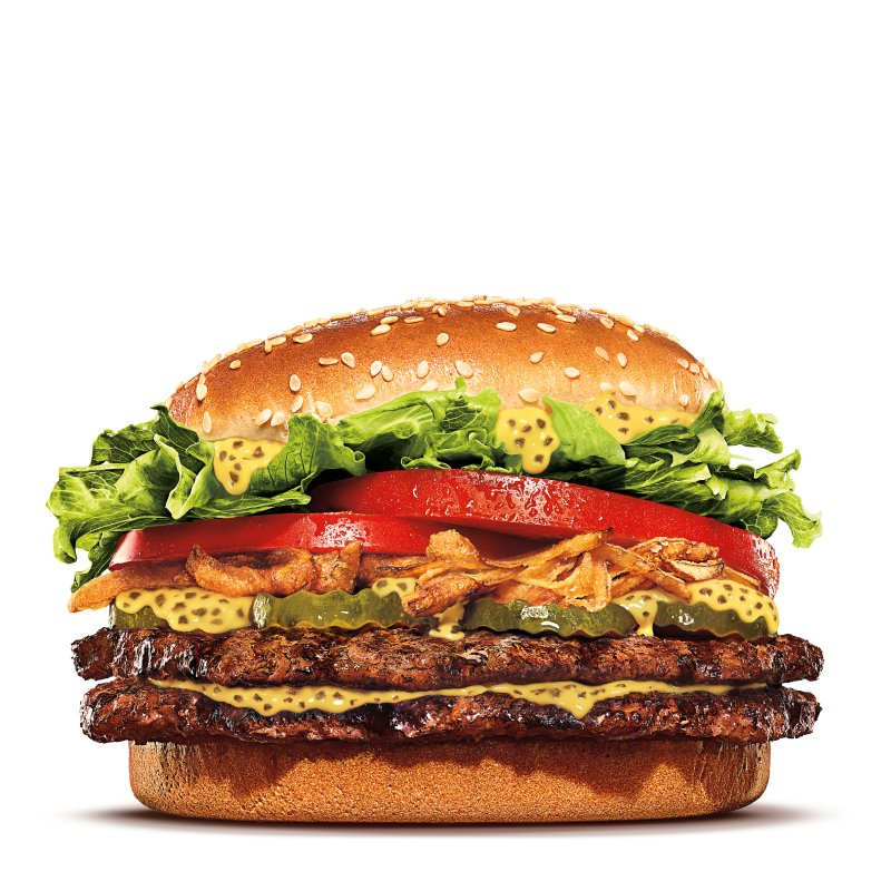 Заказать Двойной ВОППЕР® - это два аппетитных, приготовленных на огне бифштекса из 100% говядины с сочными помидорами, свежим нарезанным листовым салатом, густым майонезом, хрустящими маринованными огурчиками и рубленым белым луком на нежной булочке с кунжутной посыпкой.