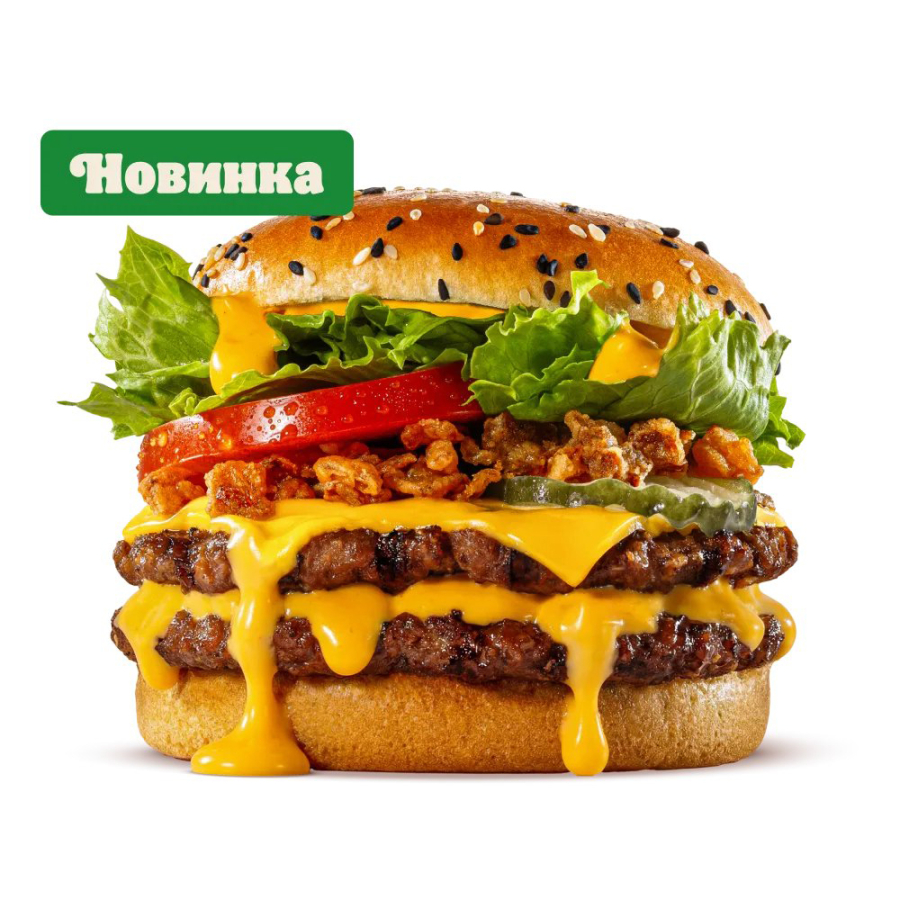 Заказать Это обновленный Биг Кинг Смоки Чеддер — две говяжьи котлеты, тягучий чеддер и двойная порция соуса Чеддер-Хамон в мягкой картофельной булочке. Свежие овощи, маринованный огурчик и хрустящий лук фри добавляют текстуры — мощный сырно-мясной вкус без компромиссов.