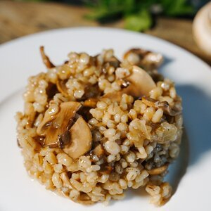Перловая крупа, шампиньоны, лук репчатый, масло растительное, специи.