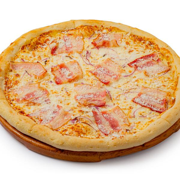 Грудинка, красный лук, яйцо, сыр Моцарелла, сыр Пармезан, соус Альфредо, Итальянские травы, масло розмариновое.