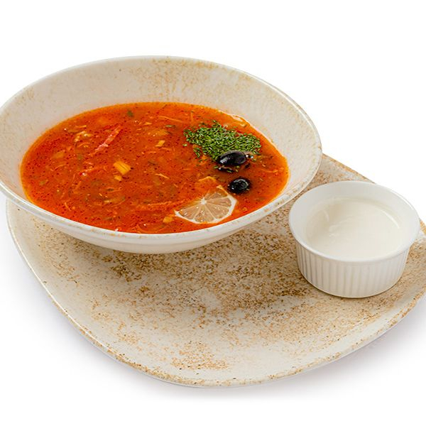 Густой наваристый суп с добавлением мясных копченостей, сочной отварной курицы, укропа, маслин и каперсов. Подаётся со сметаной и лимоном.