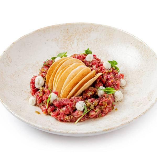 Говяжья вырезка, каперсы, огурец маринованный, Французская горчица, масло оливковое, красный лук, маринованный в малиновом пюре, майонез, паста трюфельная, тортилья.