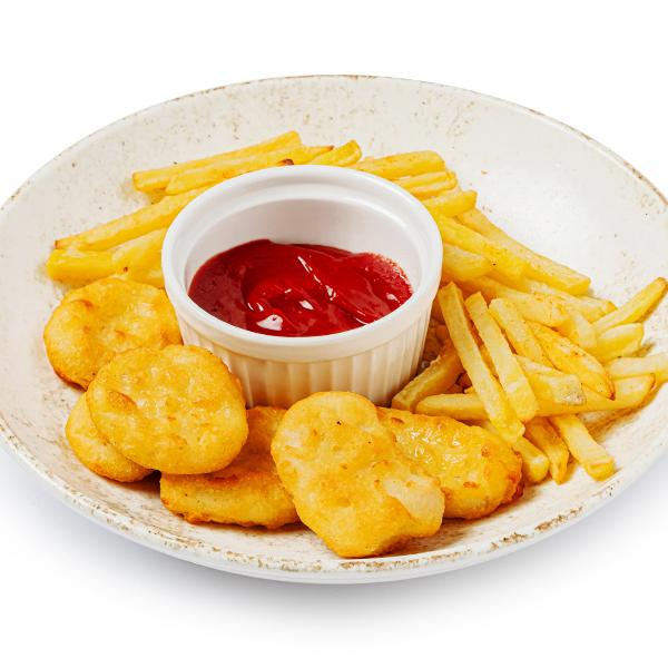 Куриные бедрышки, соус Рэнч, тортилья, сыр чеддер, салат Коул-слоу, картофельные дольки.