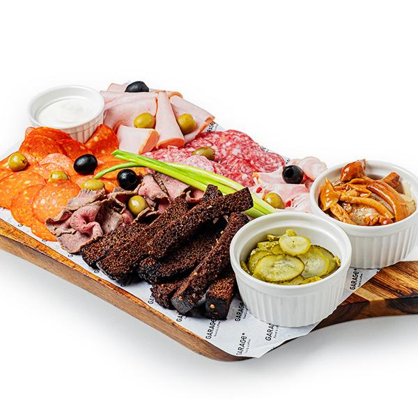Заказать Колбаса с/к, колбаса пепперони, ростбиф из говядины, ветчина, свиная грудинка, хлеб бородинский, огурец консервированный, капуста маринованная, опята консервированные, оливки, маслины, соус из хрена, лук зеленый.