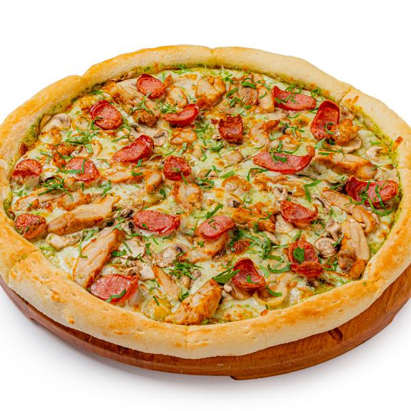 Заказать Колбаски пепперони, соус Альфредо, шампиньоны, сыр Проволоне, сыр Моцарелла, сыр Чеддер, сыр Дорблю, томат, соус Песто, масло розмариновое, петрушка.