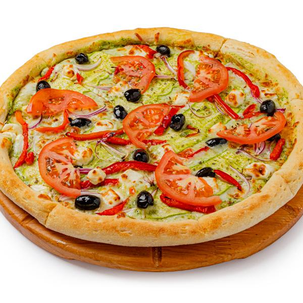 Заказать Соус из шпината, сыр Моцарелла, лук красный, цукини маринованный, перец свежий, сыр Фета, томат, маслины, масло розмариновое, приправа Французская.
