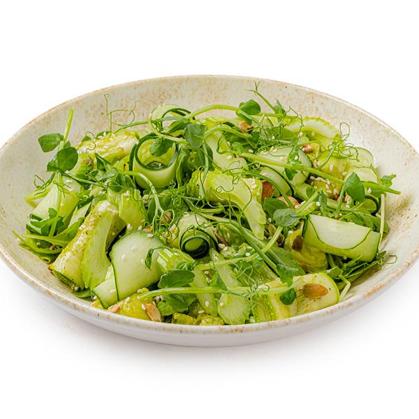 Микс салатов, сельдерей, цукини, огурец свежий, рукола, гуакамоле, соус Ростбиф, семена тыквы, кунжут белый, микрозелень. *Содержит соевый соус, сок лимона и мед.