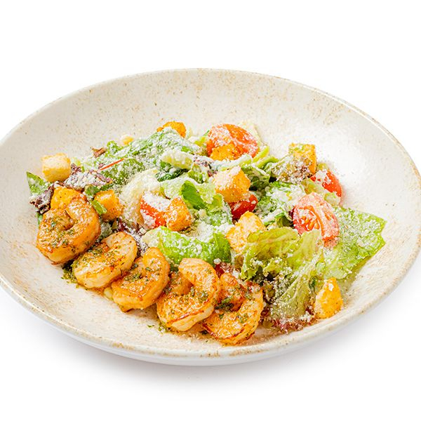 Свежий микс салатов с сочными маринованными креветками, томатами черри под насыщенным соусом Цезарь. В дополнение идут хрустящие гренки и тертый сыр Пармезан.