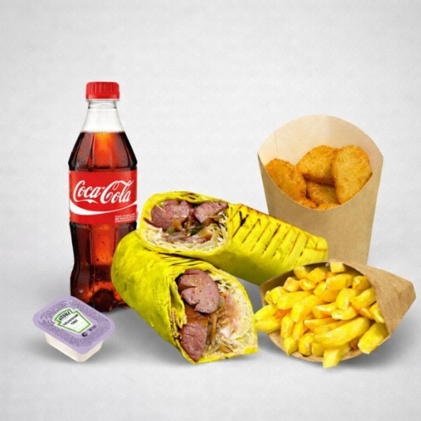 Шаурма Классическая 750г, картофель фри или наггетсы на выбор, напиток на выбор, соус на выбор.