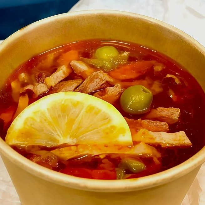 Копчёные свиные рёбра, сервелат и копчёные колбасы придают блюду насыщенный мясной вкус и аромат дыма. Солёные огурцы и оливки вносят пикантную солоноватую нотку и приятную кислинку, а томатная паста добавляет лёгкую остроту и глубину. Лимон и сметана.