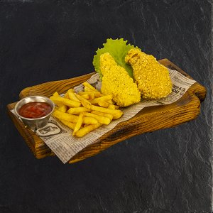 Сочные куриные ножки прожаренные в пикантной панировке с добавлением специй. Подаётся с кетчупом и картофелем фри.
