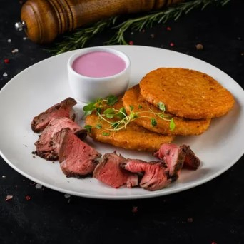 Заказать Картофельные оладьи, говяжья вырезка, репчатый лук, сливки, кетчуп.