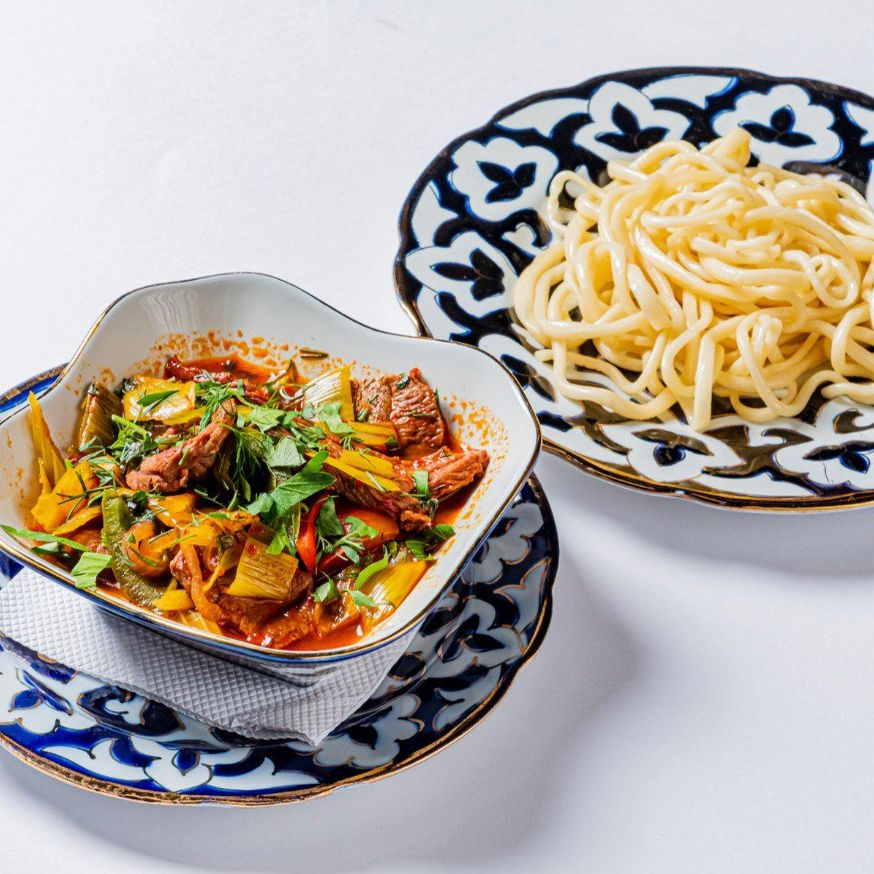 Уйгурское блюдо, состоящее из двух частей: теплого салата, говядины с мясным бульоном и гарнира - лапши собственного приготовления.