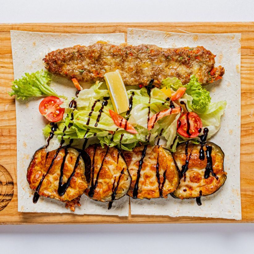 Заказать Ароматный кебаб из сочной телятины, с начинкой из сладкого перца. Подается с микс салатом, запеченными баклажанами и шашлычным соусом.