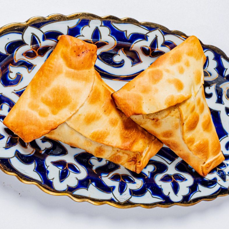 Заказать Традиционная узбекская выпечка из слоеного теста с начинкой из мелко рубленой телятины и лука.