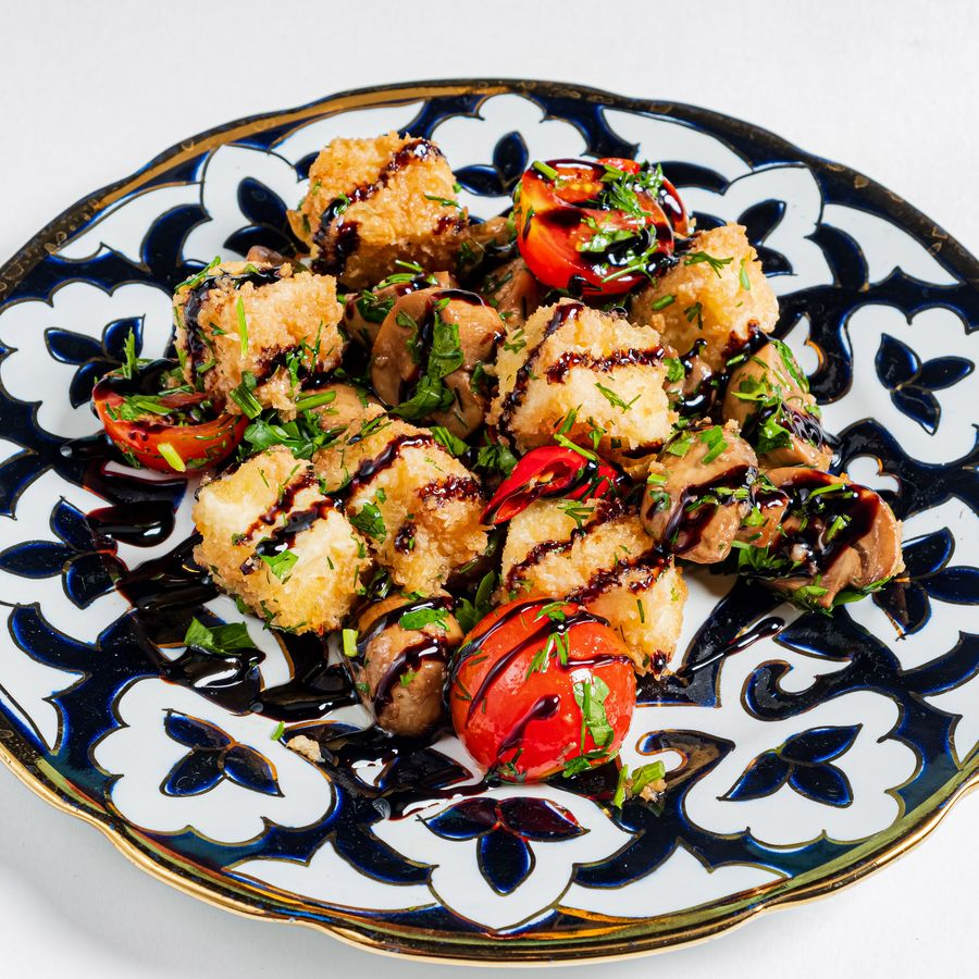 Ломтики обжаренной до хрустящей корочки брынзы с томатами черри и маринованными шампиньонами.