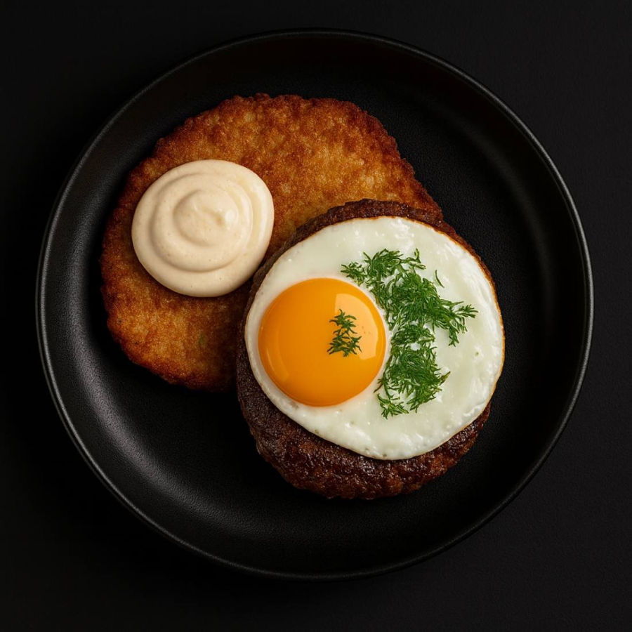 Заказать Сытное белорусское блюдо с золотистыми картофельными драниками (2 шт), хрустящими снаружи и нежными внутри. Аппетитное жареное яйцо с румяной корочкой и нежным желтком создает богатый вкус. Сочная натуральная котлета из смеси свинины и говядины добавляет мясную сытность. Густая сметана и свежая зелень завершают это традиционное блюдо, делая его настоящим праздником вкуса.