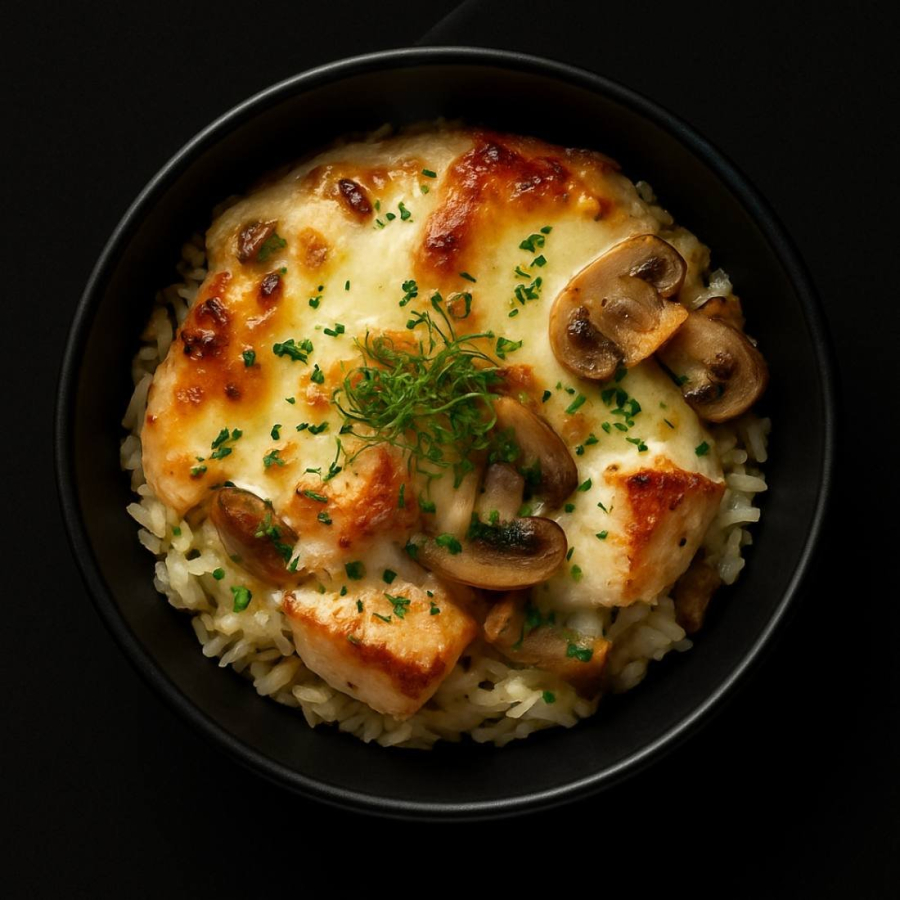 Заказать Куриное филе гриль, рис отварной, шампиньоны жареные, сыр моцарелла, соус грибной, зелень рубленая.