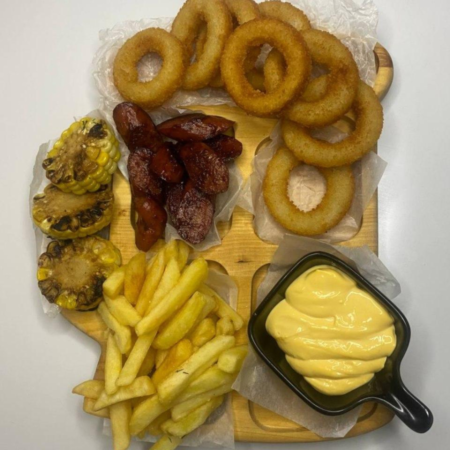 Картофель фри, луковые кольца, колбаски гриль, кукуруза гриль, соус (50г).