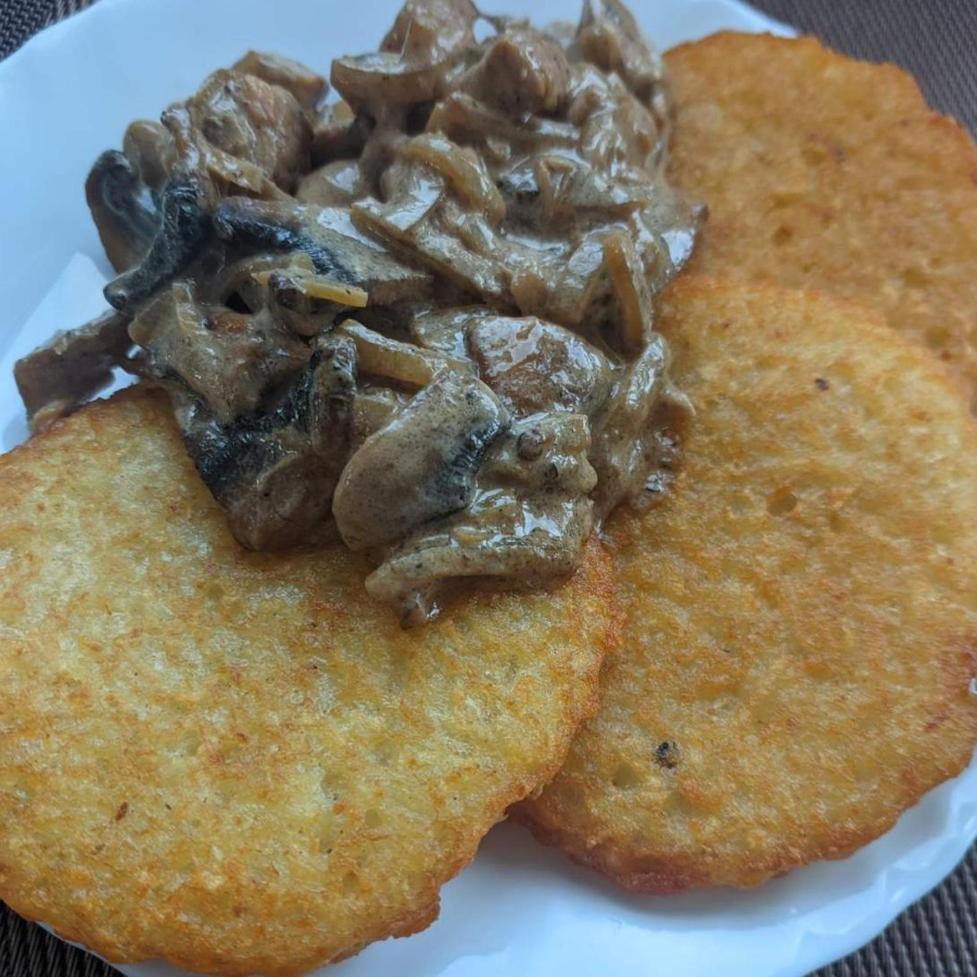 Драники, курица, грибы, лук, сливки.