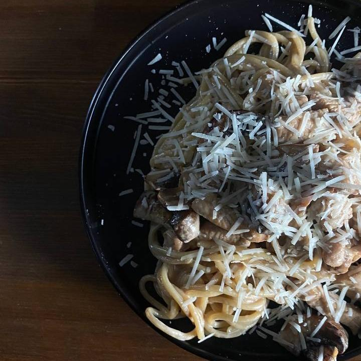 Спагетти, курица, грибы, сливки, пармезан.