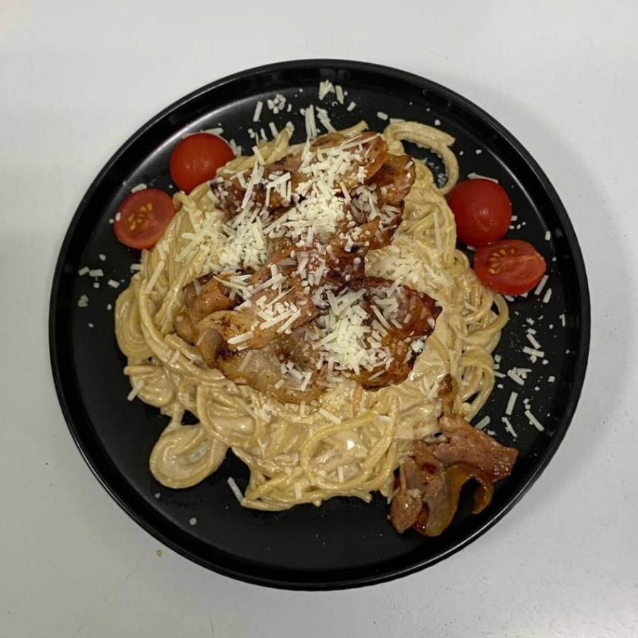 Спагетти, бекон, соус томатный, соус ким-чи, халапеньо, зелень.